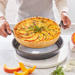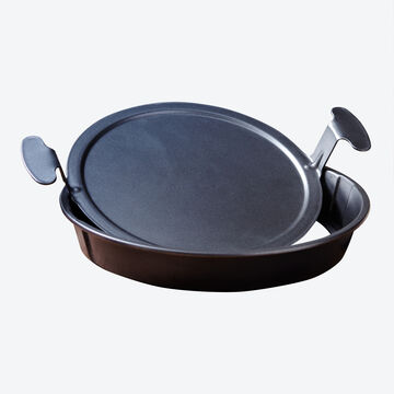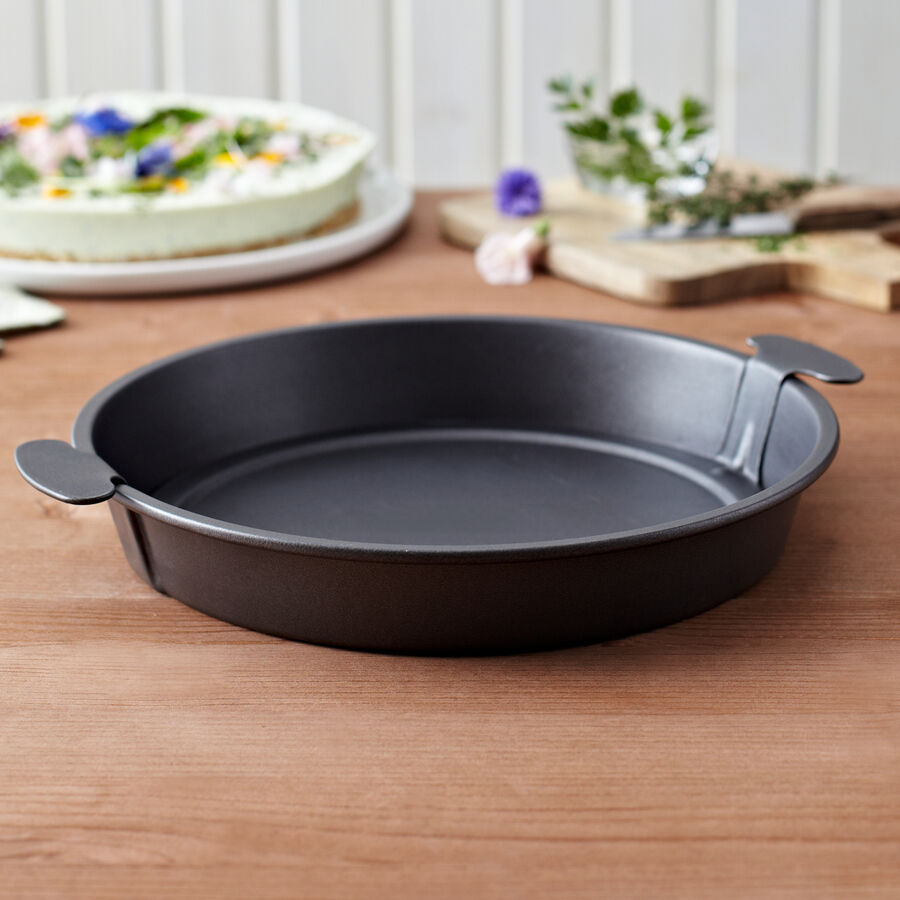 Solide Metallform mit hochwertiger Antihaftbeschichtung, Ø 26 cm, 4,5 cm hoch, mit Griffen Ø 33 cm, 5 cm hoch, backofenfest bis 240 °C, Handwäsche zum dauerhaften Erhalt der Antihaftbeschichtung empfohlen.