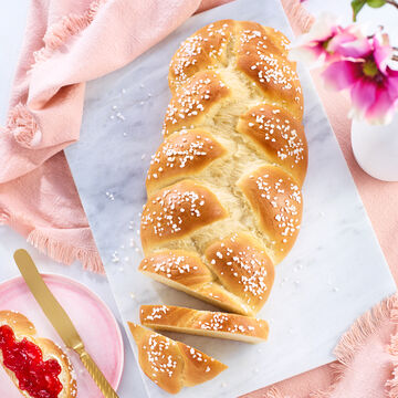 7 Den Zopf mit etwas Milch bestreichen und nach Belieben mit Mandelblättchen oder Hagelzucker bestreuen. Im vorgeheizten Ofen bei 180 °C Ober-/Unterhitze etwa 20-25 Minuten backen.