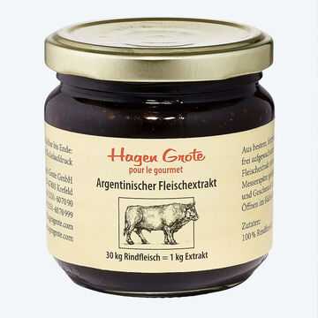 1 kg Fleischextrakt entsteht aus 30 kg argentinischem Rindfleisch. Durch stundenlanges Einkochen, Reduzieren und die Verwendung naturbelassener Grundstoffe entsteht dieses einzigartige Würzkonzentrat. Ein Teelöffel davon genügt, um Suppen und Saucen Kraft und Geschmack zu geben. Entnehmen Sie die würzigen Extrakte bei Bedarf in kleinen Portionen.