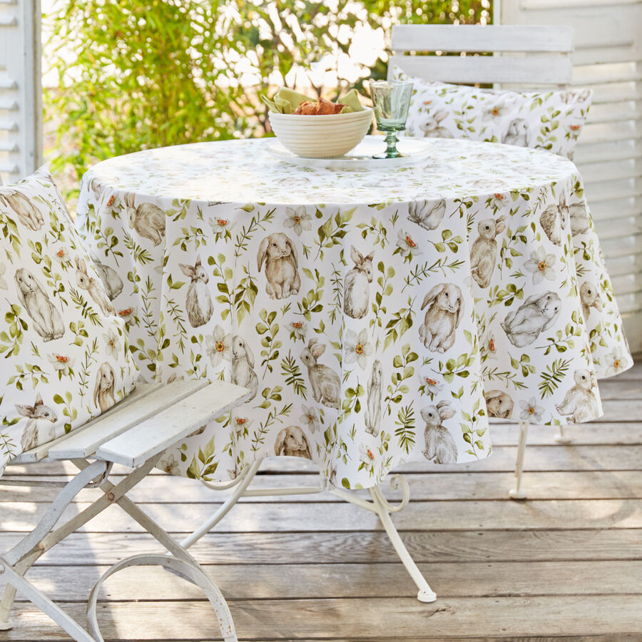Aus einer deutschen Traditionsweberei stammt diese österlich bedruckte Kissenhülle aus reiner Baumwolle. Fein ausgearbeitete Hasenmotive, Blätterranken und Blüten sowie die zarte Farbgebung zaubern eine frühlingshafte Optik. Robuster, widerstands- und strapazierfähiger Stoff. 100 % Baumwolle mit Druckmotiv, hochwertig verarbeitet, schadstoffgeprüft nach Standard 100 by Oeko-Tex, Maschinenwäsche 30 °C.