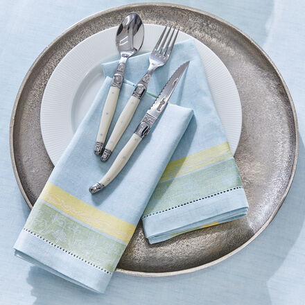 Handgemalte österliche Motive aus dem 19. Jahrhundert bilden die Vorlage für diesen äußerst hochwertigen Leinen-Tischläufer. Sie werden auf historischen Webstühlen mit alten Jacquard-Lochkarten gewebt. Frühlingshafte Blüten, Schmetterlinge und Hasen in Pastell-Tönen verleihen zusammen mit der natürlich glänzenden, changierenden Oberfläche eine luxuriöse Optik und zauberhafte Leichtigkeit. 100 % Leinen von höchstem Standard (218 g/m²), sorgfältig mit Hohlsaum verarbeitet und nahezu unendlich haltbar. Uni blau mit mehrfarbigem Rahmen. Waschbar bei 60 °C.