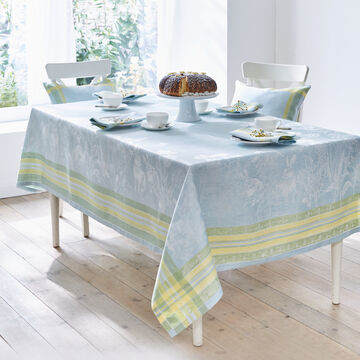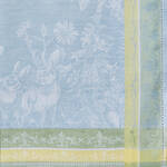 Handgemalte österliche Motive aus dem 19. Jahrhundert bilden die Vorlage für diese äußerst hochwertigen Leinen-Tischdecken. Sie werden auf historischen Webstühlen mit alten Jacquard-Lochkarten gewebt. Frühlingshafte Blüten, Schmetterlinge und Hasen in Pastell-Tönen verleihen zusammen mit der natürlich glänzenden, changierenden Oberfläche eine luxuriöse Optik und zauberhafte Leichtigkeit. 100 % Leinen von höchstem Standard (218 g/m²), sorgfältig mit Hohlsaum verarbeitet und nahezu unendlich haltbar. Eckige Tischdecken uni blau mit mehrfarbigem Rahmen, runde Tischdecke uni blau, ohne Rahmen. Waschbar bei 60 °C.