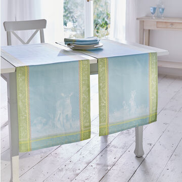 Handgemalte österliche Motive bilden die Vorlage für diesen äußerst hochwertigen Leinen-Baumwoll-Tischläufer. Österliche Hasen, Gänse und Hühner in Pastell-Tönen verleihen zusammen mit der natürlich glänzenden, changierenden Oberfläche eine luxuriöse Optik und zauberhafte Leichtigkeit. 50 % Leinen, 50% Baumwolle, mit Couvert-Ecken und nahezu unendlich haltbar. Uni blau mit mehrfarbigem Rahmen. Waschbar bei 60 °C.