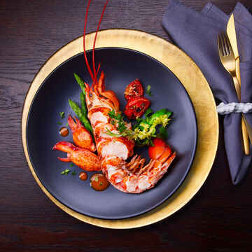 Die gefüllten Hummerhälften mit zerlassener Butter beträufeln und bei 200 °C im vorgeheizten Ofen 10 Minuten garen. Hummersauce erwärmen und mit dem Hummer in der Schale auf vorgewärmten Tellern anrichten. Mit Ofentomaten, einigen Salatblättchen, grünem Spargel und Thymian garnieren.
