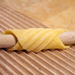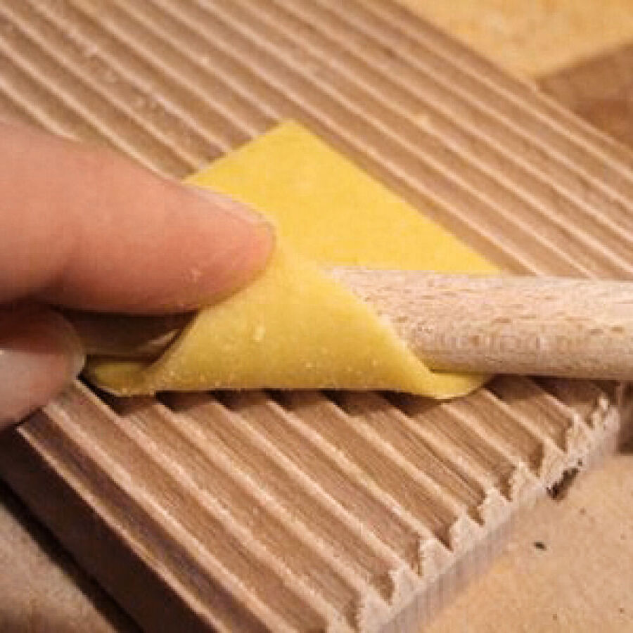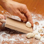 Gnocchi-Teig zu fingerdicken Strängen formen. 3 cm lange Stücke abstechen und mit sanftem Druck über das Gnocchi-Brett rollen. So erhalten Gnocchi zur besseren Saucenbindung schnell und gleichmäßig ihre schön gerillte Form. Oder machen Sie darauf eine andere italienische Spezialität: Garganelli (eine Spezialität aus der Emilia Romagna) sind um das Rollholz zu Röhrchen geformte Teigquadrate. Über das Gnocchi-Brett gerollt, mit gleichmäßigen Rillen versehen, nehmen sie ebenfalls mehr Sauce auf und sehen besonders attraktiv aus.