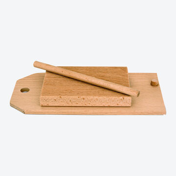 Buchenholzbrett, 21 x 9,5 x 2,5 cm hoch, Rollholz ø 1 cm, 19 cm lang.