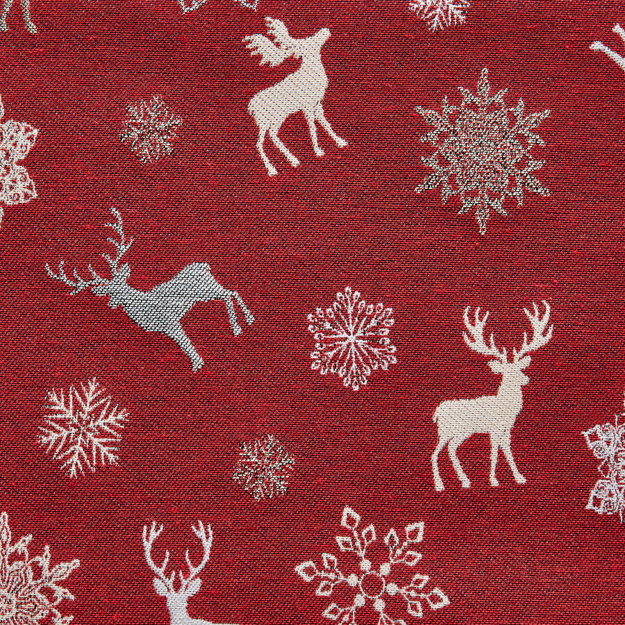 Die klassische französische Jacquard-Webtechnik erzielt einen ausgeprägt edlen Glanz. Reliefartig treten die weihnachtlichen Hirsch- und Schneeflocken-Motive bei wechselndem Lichteinfall hervor. Das kompakte, bordeauxrote Gewebe aus langstapeliger Baumwolle behält dauerhaft seine strahlende Optik. Gefertigt in einer deutschen Traditionsweberei. 18 % Baumwolle, 82 % Polyester. Sauber und fest vernähte Ränder, strapazierfähig und alltagstauglich. Feinwäsche 30 °C.