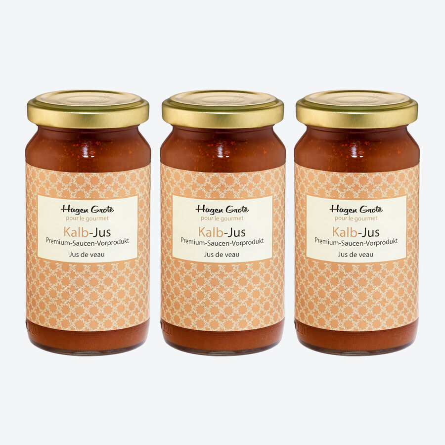 Saucen-Jus: Basis erstklassiger Fleischsaucen --- Für intensive, hocharomatische Fleischsaucen ist Jus (französisch = Saft) die klassische Basis der Spitzenküche. Viel kraftvoller und aromatischer als Fond entsteht sie in aufwendiger Herstellung aus angerösteten Fleischknochen, Röstgemüse und viel Fleischfond. In ca. zwölfstündiger (12!) Kochzeit werden die aromatischen Geschmacksstoffe aus Fleischsaft und Röstaromen immer stärker konzentriert. Es wird mehrfach abgeschäumt und je nach Fleischsorte mit Weiß- oder Rotwein aromatisiert. Nach dem Erkalten wird das ausgetretene Fett entfernt. Zur Fertigstellung kann eine klassische Bindung mit untermontierter Butter, Mehl, Mehlbutter oder Speisestärke erfolgen. Je nach Verwendung wird die Sauce mit Sahne, Alkohol (z. B. Portwein, Cognac, Noilly Prat), Kräutern und Gewürzen verfeinert. Ebenso köstlich ist Jus als Basis von Ragouts und gemischt mit Gemüse, Pilzen oder Geschnetzeltem. Unsere Jus entsteht als Saucenbasis für die gehobene Küche nach höchsten Standards in klassisch handwerklicher Herstellung. Nur rein natürliche Zutaten ohne jegliche Farb- oder Konservierungsstoffe.Rezept und Herstellung Hagen Grote Exklusiv --- Geflügeljus, 3 x 200 ml