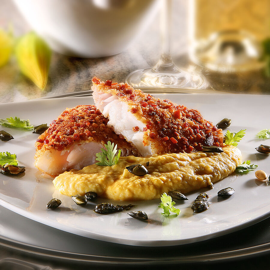 Kürbiskerne in einer beschichteten Pfanne ohne Fett rösten. Die Fischfilets und das Kürbispüree auf vorgewärmten Tellern anrichten. Etwas Kürbis-Koriander-Pesto um den Fisch träufeln und mit gerösteten Kürbiskernen bestreuen.