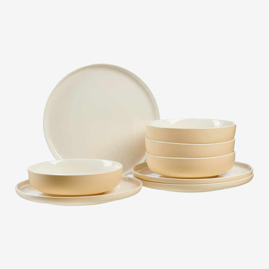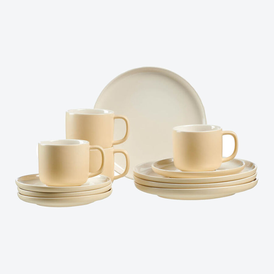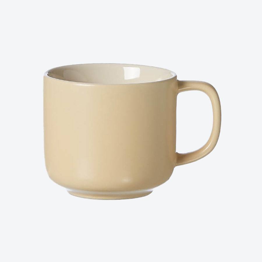 Mit ihrer eleganten Schlichtheit verkörpern die gradlinigen Formen den skandinavischen Stil, der die typische "Hygge" Gemütlichkeit ausstrahlt. Das klare Design mit feiner Textur und frischer Farbgestaltung in Rosa, Mintgrün oder Vanillegelb wird in seiner Wirkung durch den edlen Kontrast der Glasur unterstützt. Die Innen- und Oberseiten der Geschirrteile sind mit einer Glanzglasur veredelt, Außen- und Unterseiten haben eine Mattglasur und geben dem Geschirr damit einen warmen, angerauten Soft-Touch.