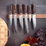 Der Messerkern besteht aus extrem hartem, korrosionsbeständigen VG MAX Stahl mit einer Härte von 61 (±1) HRC. Er wird von 32 Lagen Damaszenerstahl ummantelt, die dem Messer eine unvergleichliche Anatomie gibt, die hart und elastisch zugleich ist. Die beidseitig geschliffene Klinge ist durch ihr geringes Gewicht angenehm in der Handhabung und garantiert einen sauberen und präzisen Schnitt. Perfekt in der Hand liegen die fein laminierten, hygienischen Walnussholz-Griffe.