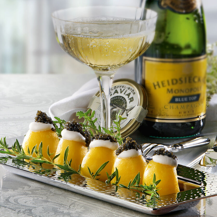 2 Aufrecht auf einen Teller stellen und etwas Creme fraîche darauf geben. Mit einem Löffelchen Kaviar garnieren.