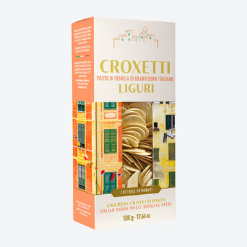 In meisterhafter Handarbeit entsteht unsere traditionelle Pasta aus Ligurien nach überliefertem Rezept. Ausschlaggebend für ihren guten Geschmack sind Qualitäts-Hartweizengrieß und frisches Quellwasser. Ihre angenehm feste Konsistenz bewirkt die sortenspezifische, langsame und schonende Trocknung (18 Stunden). Croxetti: Dank ihrer porösen Oberfläche und den Vertiefungen nimmt die münzförmige Pasta, die auch unter dem Namen Corzétti bekannt ist, Saucen besonders gut auf. Einmalig harmoniert sie mit Pesto, Pilz- und Walnuss-Saucen. Der Ursprung der Croxetti liegt bereits in der Antike, was sie zu einer der ältesten Nudelsorten Italiens macht. Wohlhabende Familien ließen die runden Nudeln in früheren Zeiten mit ihrem Familiensymbol verzieren, um ihre Gäste zu beeindrucken. Den Namen erhielt die Sorte durch den Holzstempel (Croxetto), der das Emblem in den Teig bannte. Bis heute stellen traditionelle Werkstätten in Genua Holzstempel für Croxetti her.