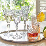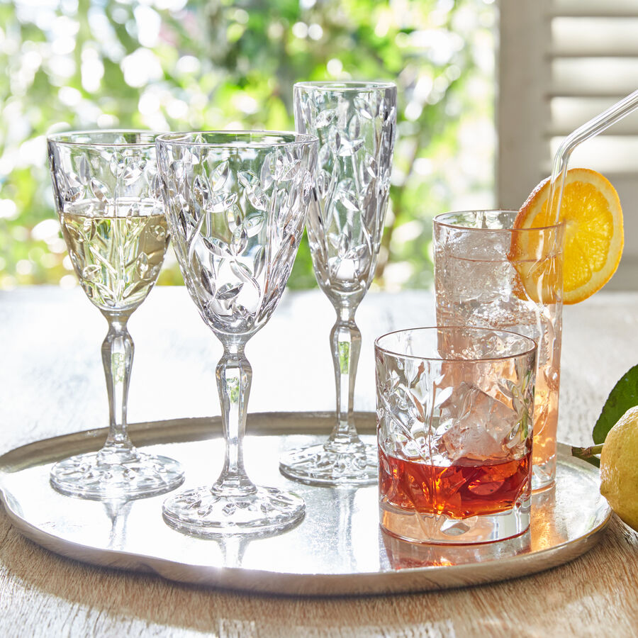 Diese italienischen Kristallgläser ziert über die gesamte Länge des Glases ein filigranes Dekor mit Stielen und Blättern, das sich spielerisch in Richtung Rand öffnet. Durch die hohe Lichtbrechung des Materials sind die Wassergläser besonders transparent und klar. Als Blickfang jeder Tafel präsentieren sie Getränke äußerst elegant und halten sie durch ihre Form schön kühl.