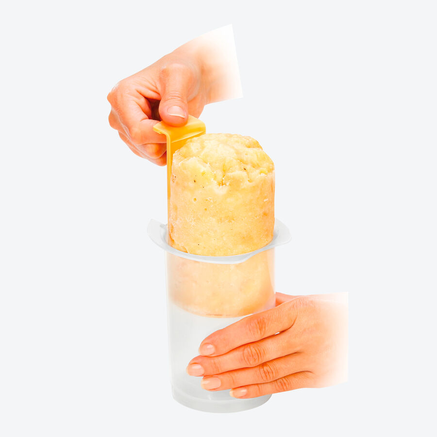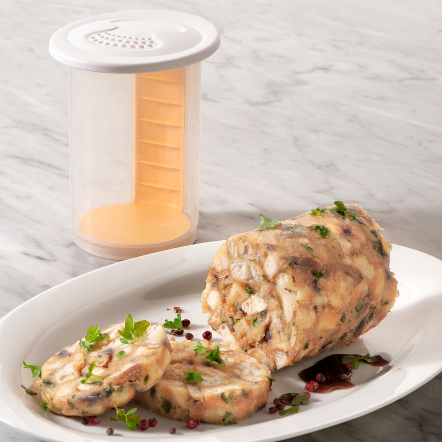 Für Semmel-, Kartoffel- oder glutenfreien Knödel den vorbereiteten Knödelteig in den Knödelformer geben. Nach Anleitung im Topf oder der Mikrowelle garen. Fertigen Teig mit dem Liftboden einfach aus der Form nehmen. Beim Garen eingeprägte Markierungen helfen beim Aufschneiden in 8 wunderbar gleichmäßige Knödelscheiben.