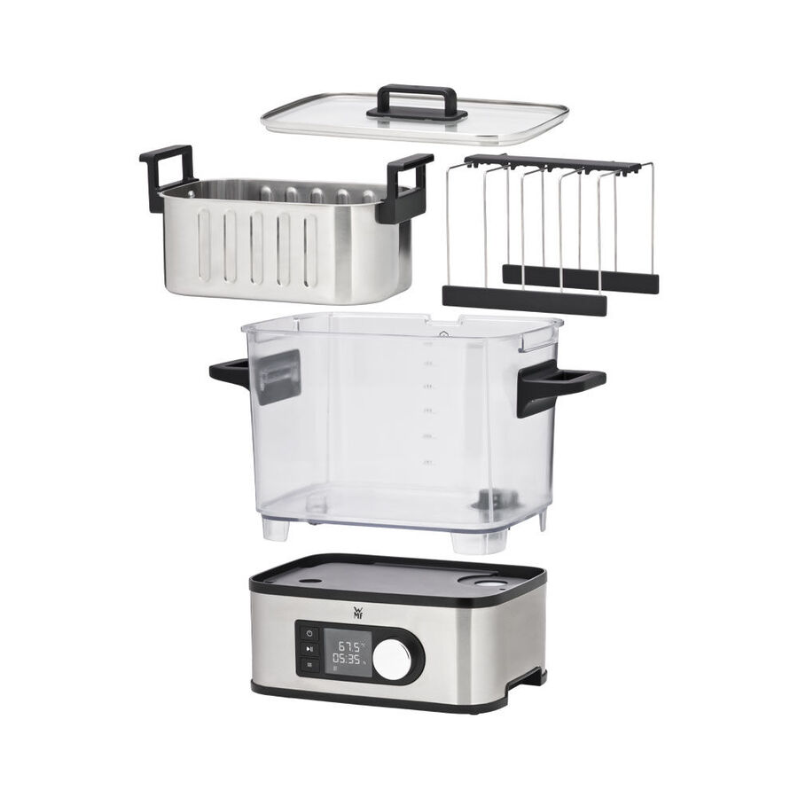 Cromargan Edelstahl Korpus, 39,5 x 15,5 x 32,5 cm (B/T/H), wiegt 3,8 kg, transparenter 8 l Wasserbehälter, 3 l Niedertemperatur-Gareinsatz, Sous Vide Halterung für 4 Vakuumbeutel, 72 Stunden Timer, 230V/1.500W, 1,2 m Anschlusskabel, Kabelaufwicklung, geprüfte Sicherheit. Kommt mit Rezeptbuch aus der Sterneküche.