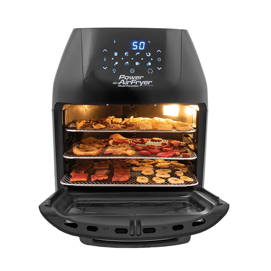 Dank modernster Heißluft-Technologie bereiten Sie knusprige Pommes frites, leckere Zwiebelringe oder saftige Chicken Wings nahezu fettfrei und ganz ohne Öl, Frittierfett oder Butterschmalz zu. Heißluftwirbel umgibt die Speisen konstant. Hähnchen werden außen schön knusprig und innen supersaftig - ganz ohne lästigen Frittiergeruch. Mit 8 voreingestellten Programmen lassen sich Speisen frittieren, dörren, braten, backen oder auch toasten. Praktisch: Dank großem Sichtfenster haben Sie Gemüse, Fleisch oder Fisch während des Garvorgangs stets im Blick. Gleichzeitiges Arbeiten auf 3 Ebenen.