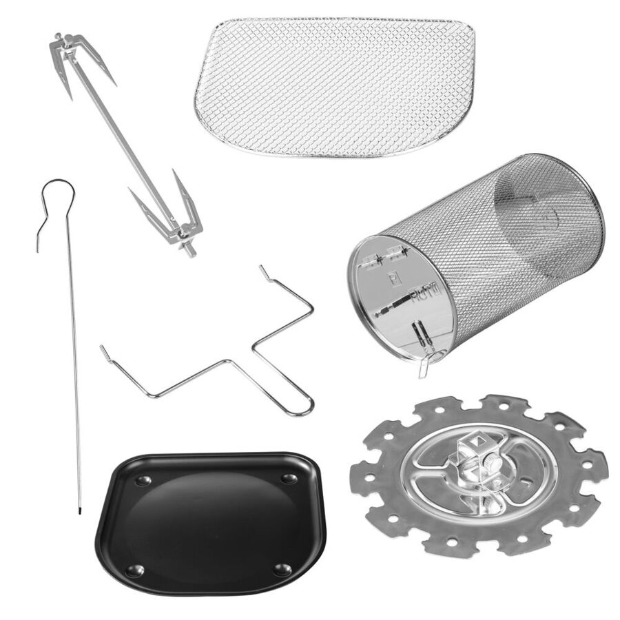 Korpus Kunststoff 32 x 36 x 34 cm, Innenraum 26 x 24 x 24 cm (B/T/H), wiegt 7,16 kg, 230V/1.800W. Zeitschaltuhr mit automatischer Abschaltung, Signalton. Umfangreiches Zubehör mit Gitter, Drehkorb (für 500 - 600 g Pommes frites), Grillspieß, 3 Dörreinsätze, Abtropfschale, Hilfsgriff für Spieß und Drehkorb. 1,20 m Anschlusskabel, Korb 12 cm Durchmesser, kommt mit Rezeptheft.