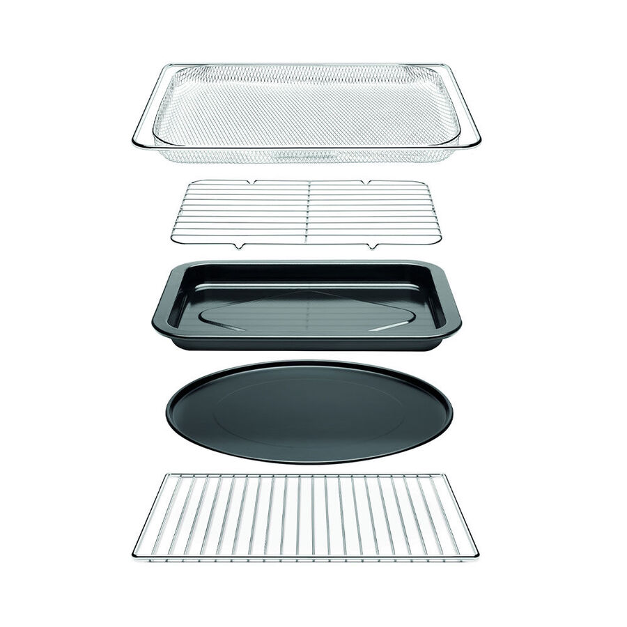 Edelstahlkorpus gebürstet, Temperatur von 50 bis 230 °C, 48 x 40 x 28 cm (B/T/H), Inhalt 22 l, wiegt 13 kg, 230V/2.400W. Lieferumfang: Ofen, Anschlusskabel 1,4 m, Airfry-Frittiergitter, Grillrost, Röstblech 28 x 33,5 cm, Pizzablech Ø 30 cm, Drahtgitterrost.