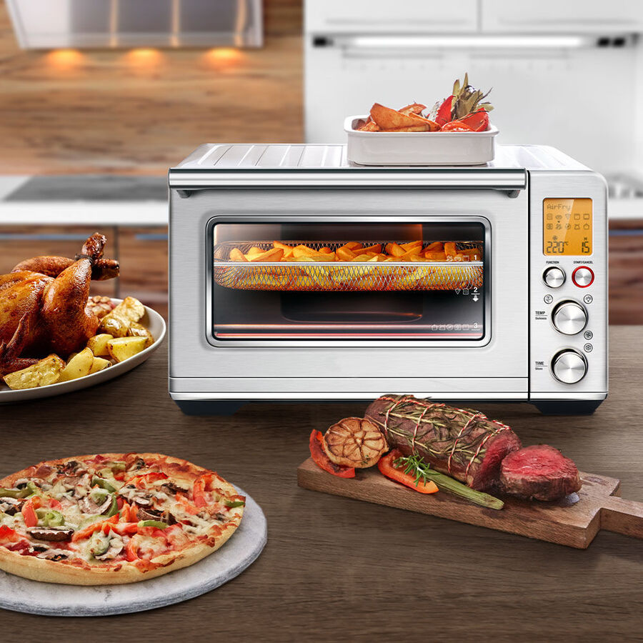 Der in 5 Minuten aufgeheizte Smartofen ist mit Element IQ®-Technologie ausgestattet, um die Hitze durch 5 unabhängig voneinander arbeitende Quarz-Heizelemente genau an die richtige Stelle zu leiten. Die normale Umluftstufe ermöglicht schnelles, gleichmäßiges backen und braten. Die Super-Umluft ist optimal für das Frittieren mit Heißluft und beschleunigt den Garprozess, indem es die kalte Luft um das Gargut schnell erhitzt. Als ideale Ergänzung zu Ihrem herkömmlichen (Einbau-)Gerät lassen sich in sich in dem Minibackofen mit Grill- und Airfry-Funktion z. B. eine 30 cm große Pizza, 6 Scheiben Toast, ein ganzes Huhn oder 9 Muffins zubereiten und - dank des Airfryers - auch knusprige Pommes, Gemüse im Backteig oder Teigtaschen. Zur leichten Anwendung stehen Ihnen folgende Voreinstellungen zur Auswahl: Airfry (Heißluftfrittieren), Toasten, Grillen, Backen, Braten, Warmhalten, Pizza, Aufwärmen und Slow Cook (Schongaren). Das LCD-Display erlaubt einen vereinfachten Zugriff auf die Funktionen und zeigt an, wann der Vorheiz-Zyklus abgeschlossen ist. Selbstverständlich können Sie auch manuelle Einstellungen vornehmen, die bis zum Abschalten des Geräts gespeichert bleiben. Dank der antihaftbeschichteten Innenwände lässt sich der Kompaktbackofen schnell reinigen.