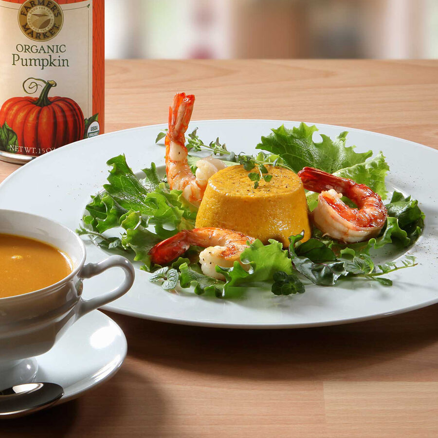 2 In gebutterte Flan-Förmchen füllen und im vorgeheizten Ofen im Wasserbad bei 160 °C 45 Minuten garen (bei Verwendung von frischem Kürbis das Kürbisfleisch vorher pürieren, passieren und auf ca. 250 g einkochen).