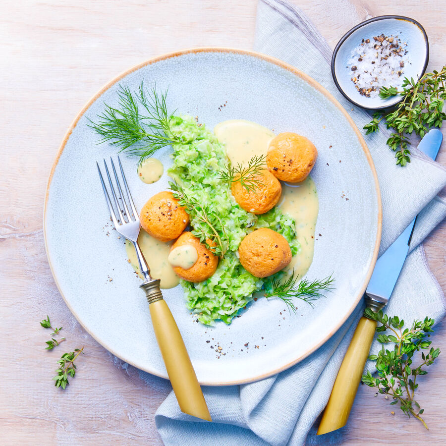 • Produktbild für 'Lachsklößchen in Dill-Senfsauce mit Spitzkohlpüree'