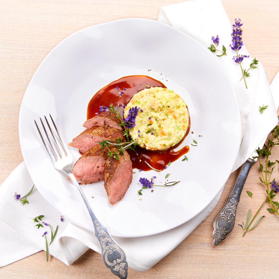 Lammrücken auf Spitzkohlpüree mit Lamm-Lavendelsauce
