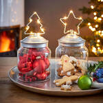 Batteriebetriebene Stern Leuchtdioden schmücken den Metalldeckel der Keksdose mit ihrem warmen gemütlichen Schein. Stoßfestes Borosilikat-Hartglas, Ø 11,5 cm, ca. 1 l Inhalt, Sternglas mit Deckel 24,5 cm hoch, Tannenglas mit Deckel 23,5 cm hoch, Batteriefach im Deckel für 3 x AA-Batterien (nicht im Lieferumfang).