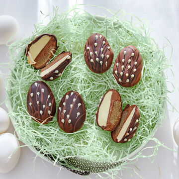 Pasteten-Ei in Vollmilch - Edelvollmilch-Schokolade gefüllt, alkoholhaltig Kakao: 43% mindestens in der Edelvollmilch-Schokolade. Zutaten: Zucker, MANDELN, HASELNÜSSE, Kakaobutter, Kakaomasse, VOLLMILCHPULVER, SAHNE, Weinbrand (3%), BUTTER, Invertzuckersirup, Marc de Champagne (1,3%), Rum (0,9%), Glukosesirup, Feuchthaltemittel: Sorbitsirup; Maisstärke, Aroma, WEIZENSTÄRKE, Emulgator: Lecithine (SOJA); Speisesalz, Farbstoffe: (Riboflavin, Carotin). Kann Spuren von anderen SCHALENFRÜCHTEN, LUPINEN, SESAM und EI enthalten.