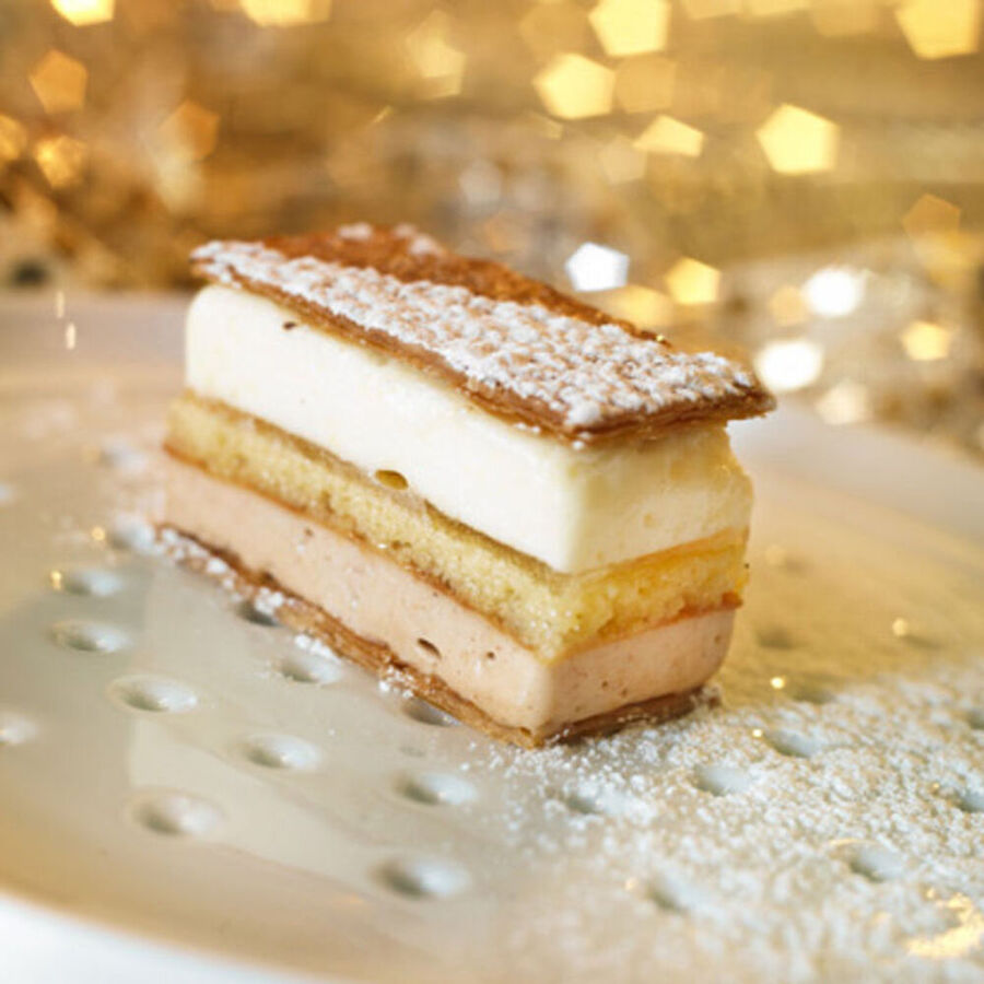 Schneiden Sie die beiden Blätterteigbögen und einen Biskuit auf die Größe Ihres Backrahmens zu. Beginnen Sie mit einer Lage Blätterteig, anschließend Haselnuss-Mousse, Biskuit, Hopfengelee und Mango-Mousse, zum Abschluss decken Sie das Ganze mit der zweiten Lage Blätterteig ab.