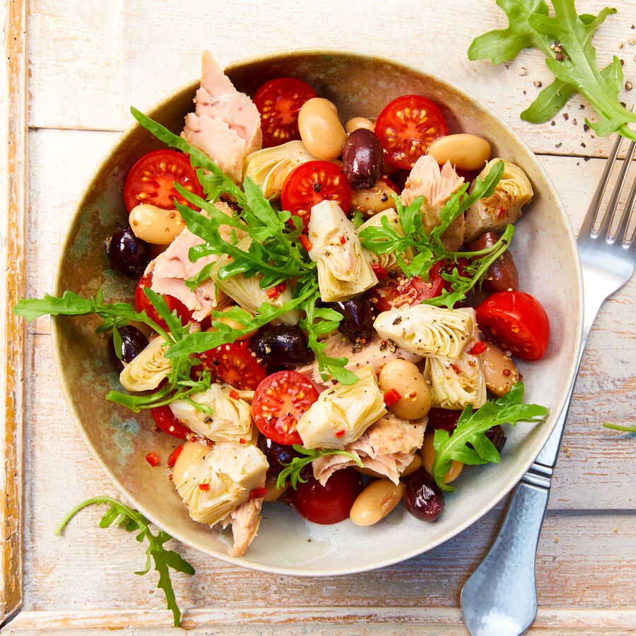 1 Artischocken, weißen Thunfisch und Bohnen in ein Sieb geben und gut abtropfen lassen. Weißen Thunfisch in mundgerechte Stücke teilen. Kirschtomaten waschen, trocknen und halbieren. Rucola waschen und trocken schleudern.