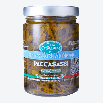 Paccasassi (Meeresfenchel: Crithmum maritimum) 36%, natives Olivenöl extra 32%, Sonnenblumenöl, Essig (SULFITE), Salz.