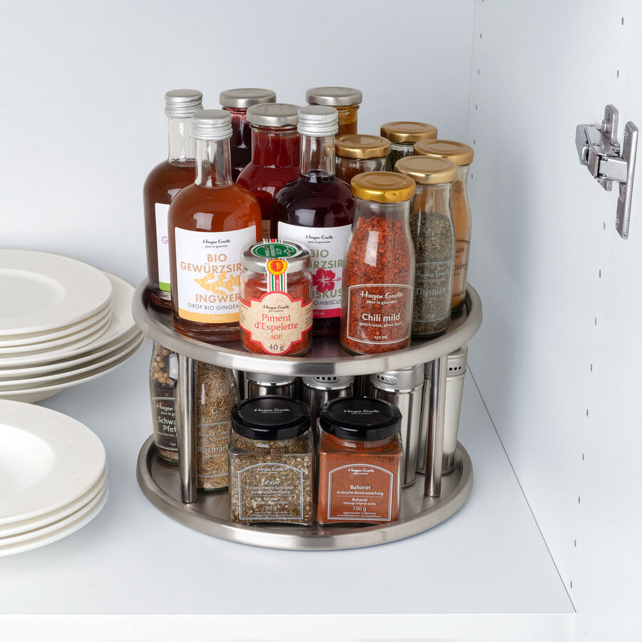 Ersparen Sie sich langes Suchen im Schrank, auf der Arbeitsfläche oder im Kühlfach. Ein leichter Dreh, ein Griff und Sie haben das Richtige zur Hand. Für schnellen Zugriff 360° drehbar. Ein erhöhter Rand schützt vorm Herunterfallen. Auf matt gebürstetem Edelstahl bleiben Fingerspuren unsichtbar.