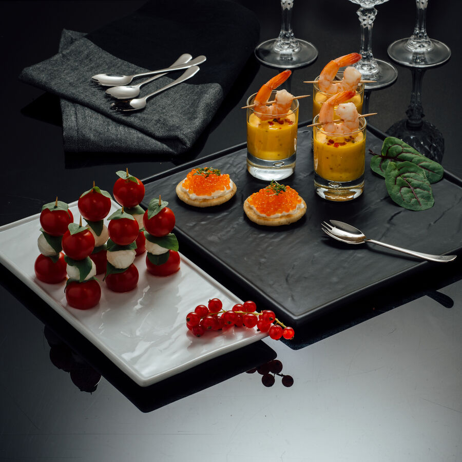 Diese Platten ersetzen zu schwere, poröse (unhygienische), nicht hitzebeständige Schieferplatten. Sie sind erheblich leichter, stoß- und schnittfest, bis 250 °C ofenfest, dürfen zum Überbacken unter den Grill und in die Mikrowelle. Optisch von ihren steinernen Vorbildern kaum zu unterscheiden, sind sie als Serviergeschirr äußerst attraktiv.