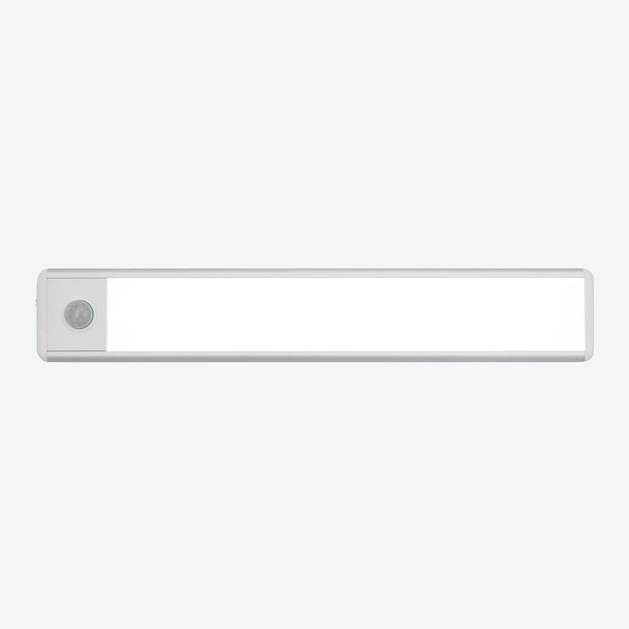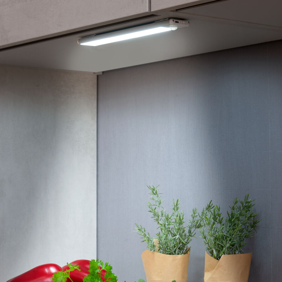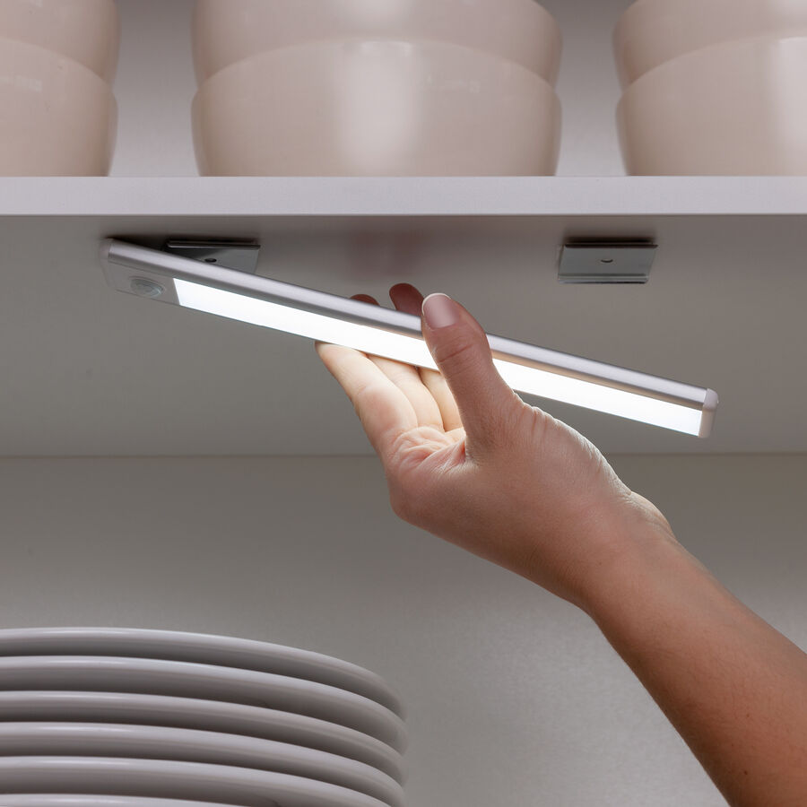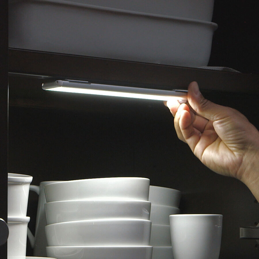 Kabellos und flexibel überall einsetzbar spendet die ultraflache LED-Lampe Licht unter Küchen-Oberschränken, in Schubladen, Vorratskammer, Treppenhaus, Garage. Magnetisch, inklusive Klebe-Halterung für nicht-magnetische Oberflächen. Aluminium/Kunststoff, 23,5 x 4 x 0,5 cm (B/T/H), Automatikmodus mit Bewegungssensor, USB-Aufladekabel.