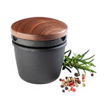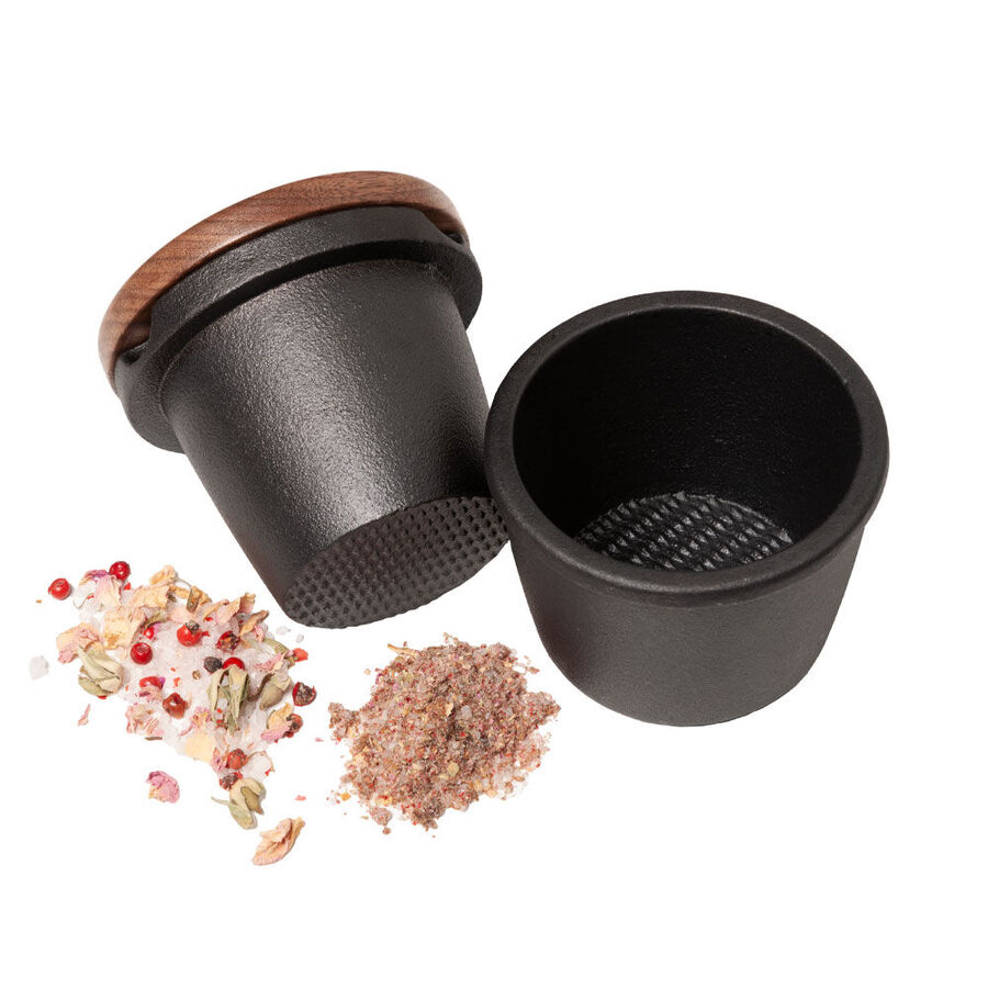 Besser als ein Stößel erschließt unsere Mörser- Mühle allerfeinste Aromen durch schonendes, großflächiges Mahlen. Der obere Mahleinsatz fügt sich mit seinen Zähnchen exakt in die untere Schale mit passendem Reliefboden. Schneller und wirkungsvoller als mit einer Gewürzreibe lassen sich darin Gewürze, getrocknete Kräuter und selbst ölhaltiges Mahlgut oder Chilis zerkleinern. Der luftdicht schließende Holzdeckel ermöglicht ein licht- und aromageschütztes Aufbewahren des Gewürzvorrats. Die Mörser-Mühle fertigt Hagen Grote nach höchsten Standards und Ansprüchen an Design, Qualität und Funktionalität aus hochwertigem, geschmacksneutralem Gusseisen. Walnussholz-Deckel, Ø 8 cm, 9 cm hoch, wiegt 1 kg.
