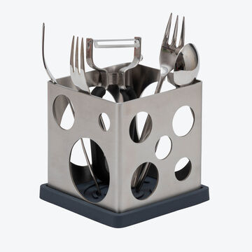 Ob Besteck, Flaschen oder Spülutensilien - dieser kompakte Würfel aus Edelstahl mit Silikonmatte bietet vielseitige Aufbewahrungsmöglichkeiten. Durch die unterschiedlichen Lochgrößen passt er sich flexibel an. Einfach mit der gewünschten Seite nach oben aufstellen. Der rutschfeste Silikonsockel dient bei Bedarf als Seifenablage oder Untersetzer.