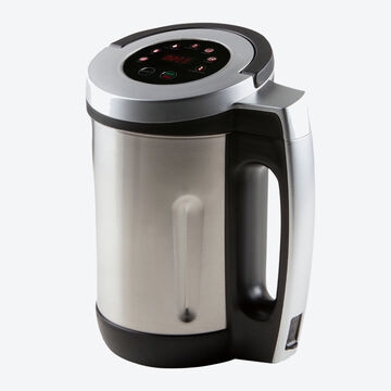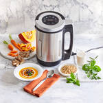 Mit 7 voreingestellten Programmen (Sojamilch, Nussmilch, Marmelade, Saft, fein, extra fein oder grob) stellen Sie in nur 20 Minuten schmackhafte Suppen und in nur 30 Minuten pflanzliche Milch (aus Soja, Nuss- und Getreidesorten) her. Dank Hochleistungstechnik und scharfer, geschwungener Klinge bleiben keine Reste oder Klümpchen nach dem Pürieren im Topf zurück. Ebenso einfach kocht der Suppenbereiter Marmelade oder Kompott ein (25 Minuten). Eine Spezialfunktion sorgt dafür, dass Gemüsestücke, wenn gewünscht, in der Suppe erhalten bleiben. Alle wichtigen Nährstoffe und wertvollen Vitamine werden durch die schonende Zubereitung be1t. 2-Minuten-Speicherfunktion für gewählte Programme, zum einfachen Ergänzen von Zutaten. Überlaufschutz (Sensor), akustisches Signal bei Programmende, LED-Display mit Countdown während des Programms. Inklusive Feinsieb zum Passieren der Pflanzenmilch oder anderer Flüssigkeiten (Suppen, Saucen, Gelees).