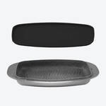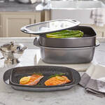 Bräter Aluguss, 39,5 x 22,5 x 11 cm (B/T/H), 6 l Inhalt, Aluguss-Deckel 39,5 x 22,5 x 4,5 cm (B/T/H), Glasdeckel 39 x 22 x 1,5 cm (B/T/H), Silikonmatte, Aluminium-Dampfeinsatz, für alle Herdarten geeignet, alle Teile hitzebeständig bis 220 °C, Bräter und Grillpfanne bis 250 °C, Handwäsche empfohlen.