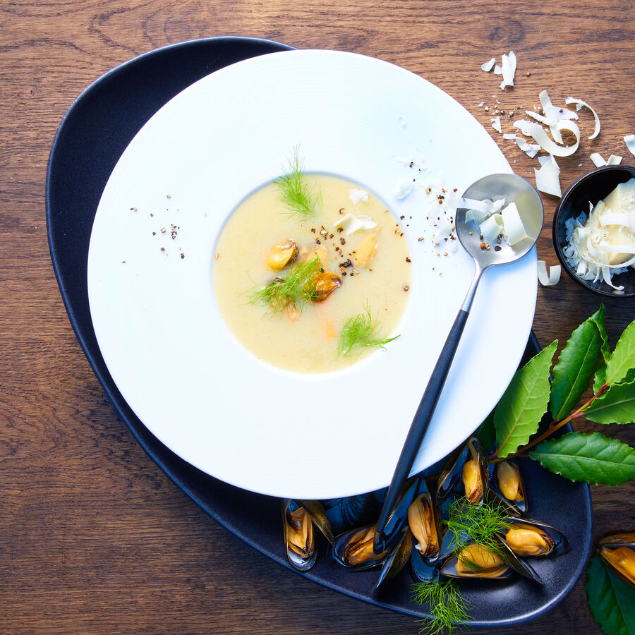 Muschelsuppe mit weißer Schokolade