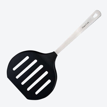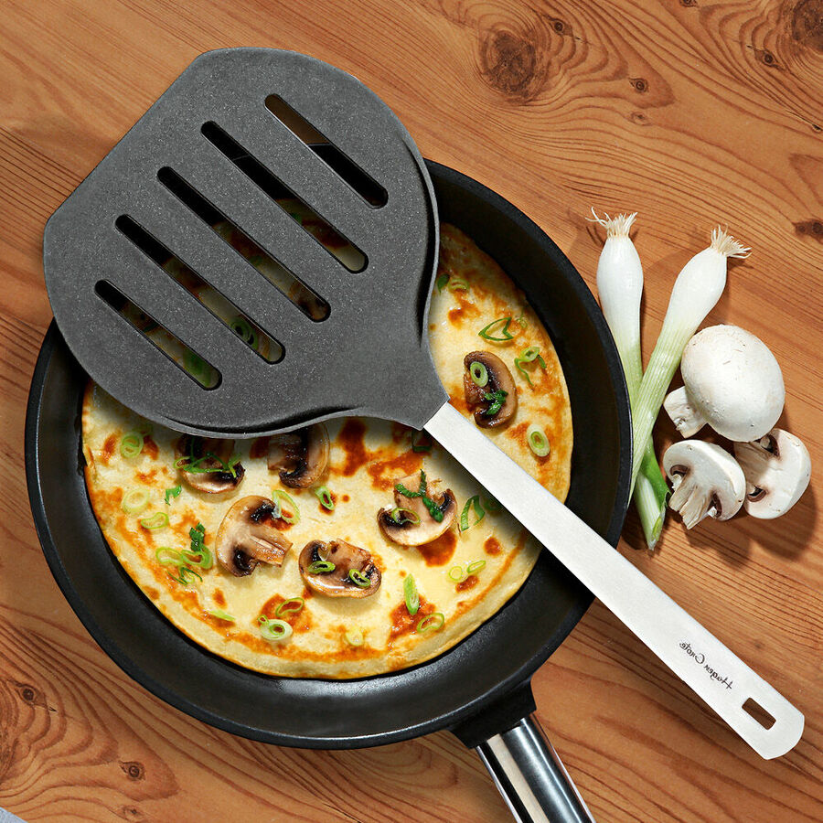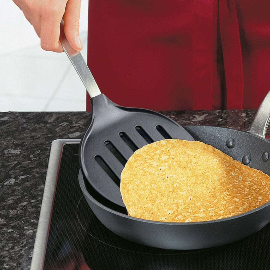Ob große Pfannkuchen, hauchzarte Crêpes oder ganze empfindliche Fische - von diesem extra großen Pfannenwender rutscht Ihnen beim Wenden nichts mehr herunter. Alles bleibt so schön appetitlich und unbeschädigt, wie es sein sollte. Durch seine abgeflachte Vorderkante gleitet der Wender problemlos unter jede empfindliche Speise. Überschüssiges Bratenfett läuft durch Löcher ungehindert ab. Leicht nach oben gebogene Edelstahlgriffe mit Aufhängeöse erleichtern Ihnen alle Arbeiten in der Pfanne.