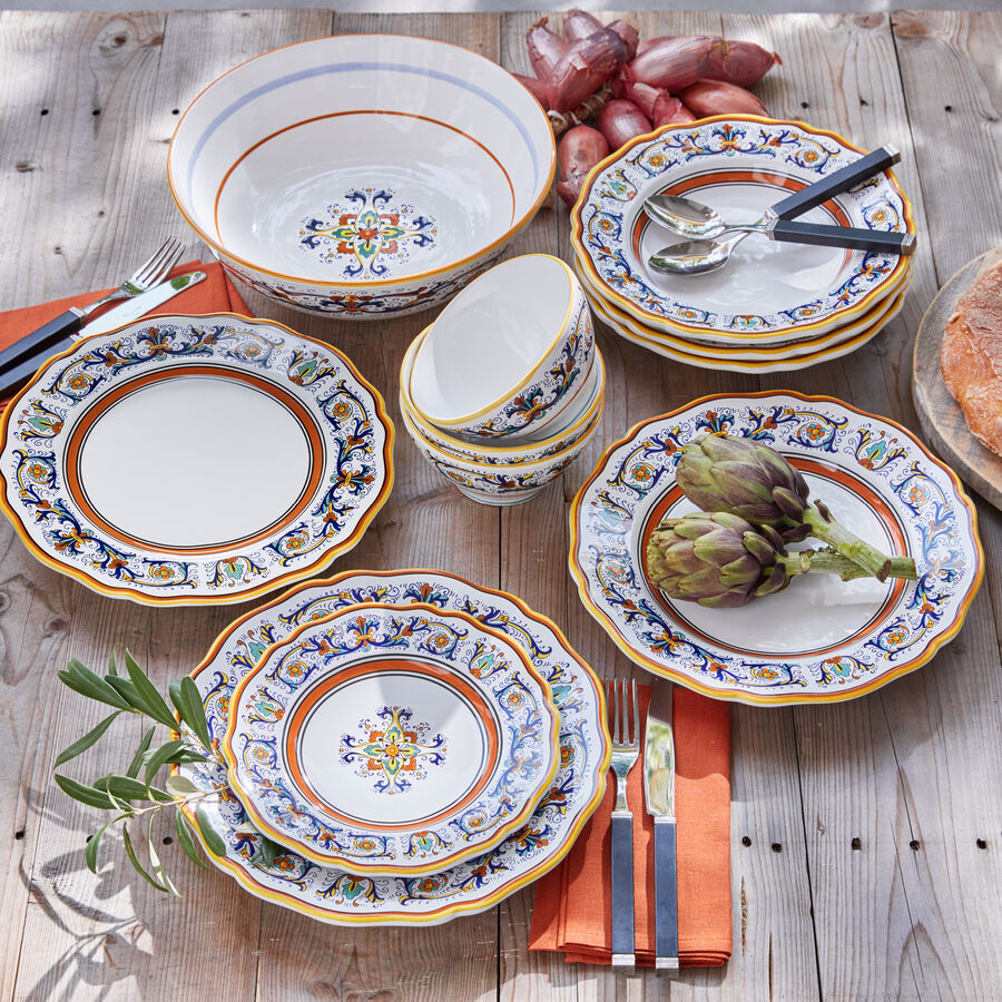 Das Örtchen Deruta ist für seine einzigartige Keramik weltbekannt. Die Ursprünge des 'Ricco Deruta' genannten Dekorstils gelangten schon im Mittelalter aus dem Orient nach Italien. Die formvollendeten Dekore mit enormer Leuchtkraft in den typischen Farben Kobaltblau und Chromgelb entstehen noch heute in Handmalerei. In Anlehnung an diesen Stil, werden Nova Deruta Salatschalen immer noch mit viel hergestellt. Die Fertigung ist sehr aufwändig. Jede Salatschale ist ein kleines Meisterwerk und verleiht einem gedeckten Tisch ein stilvolles, fröhliches Flair. Dank der hohen Brenntemperaturen ist das Nova Deruta Geschirr zudem äußerst widerstandsfähig, spülmaschinenfest und für die Mikrowelle geeignet.