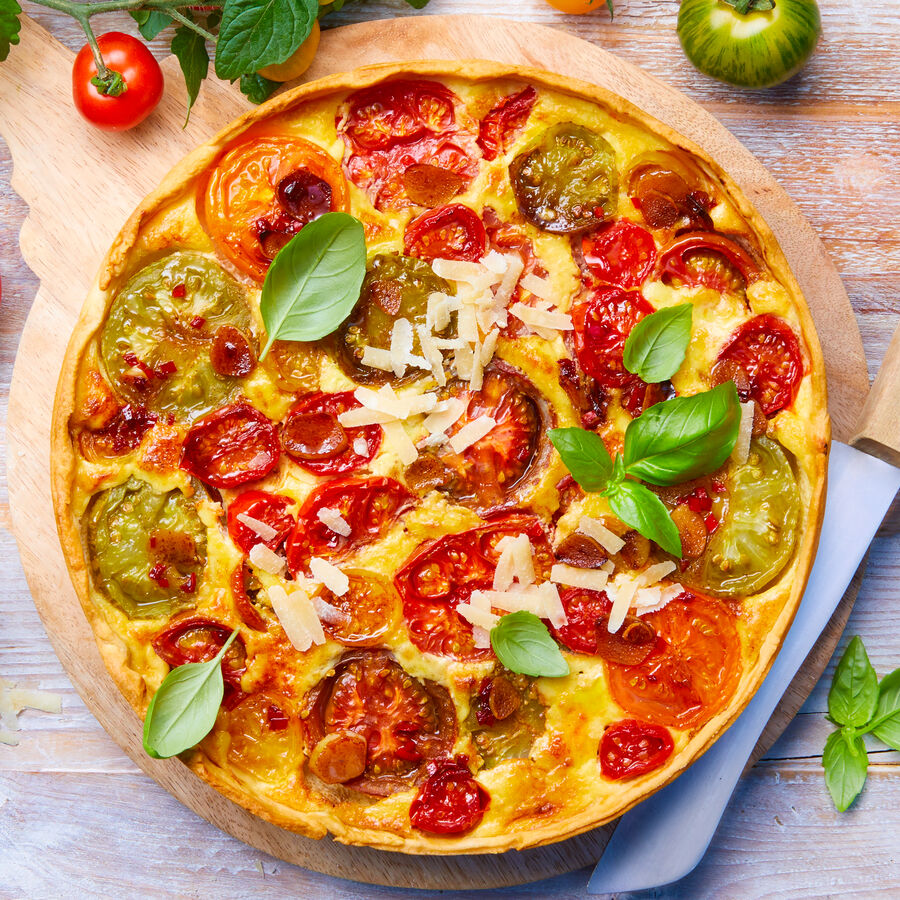 2 Die Tomaten vom Stängelansatz befreien, halbieren und mit der Schnittfläche nach oben auf ein Backblech setzen. Mit Salz, Pfeffer und Zucker würzen. Olivenöl darüber träufeln. Gleichzeitig mit dem Mürbeteig 15 Minuten bei 200 °C im Ofen backen.