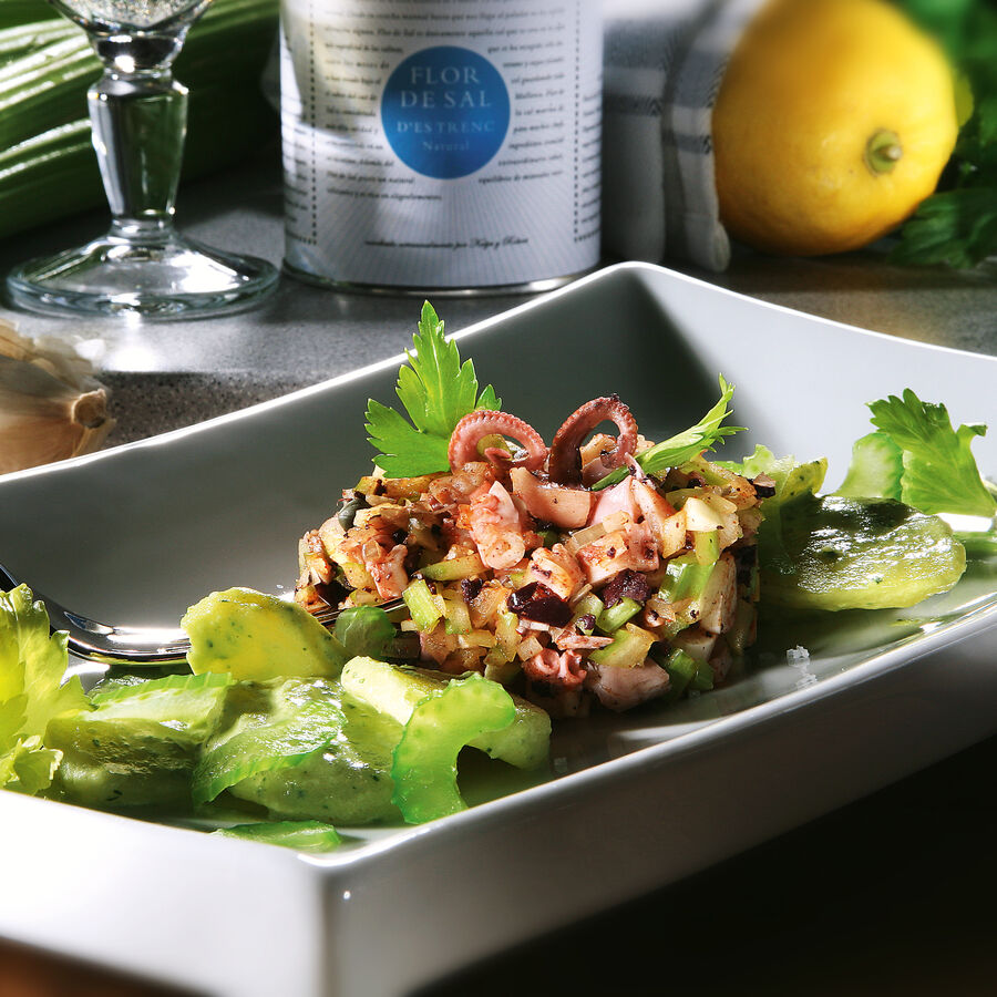 2 Den Schnabel entfernen und die Fangarme in 5 mm dünne Scheibchen, den Körper in Würfelchen schneiden. Von der Selleriestange sorgfältig die Fäden abziehen. Die Stange mehrfach längs teilen und quer in feine Würfel schneiden. Selleriestückchen, Kapern, fein gehackte Zwiebel, Knoblauchzehen und Oliven mit den Oktopus-Stückchen mischen. Kräftig mit Fleur de Sel und pikantem Paprikapulver abschmecken.