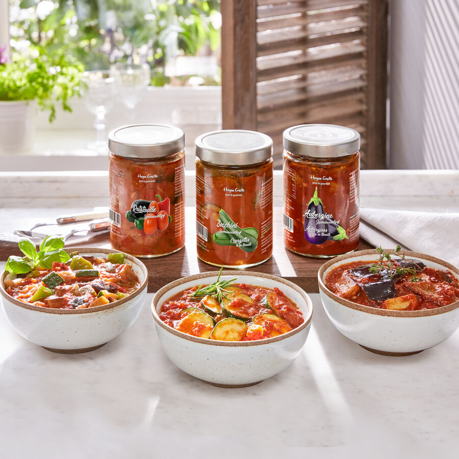 Das berühmte Gemüseragout der Provence ist fester Bestandteil französischer Küche. Nur sonnenverwöhntes, reif geerntetes, lokal angebautes Gemüse wird in unserer Delikatessen-Manufaktur sorgfältig geschnitten und zu diesem vorzüglichen Ragout verarbeitet. Ob als Hauptgang, als Suppe oder als Beilage zu allen Fleisch-, Fisch- und Grillgerichten ist sie besonders aromatischer Hochgenuss. Zwiebeln werden in Olivenöl angeschwitzt und dann zusammen mit frischen Tomaten, Auberginen, Zucchini und Paprika geschmort. 510 g im Glas.