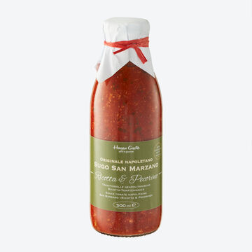 San Marzano Tomaten gelten als Italiens aromatischste Speisetomaten. Sie gedeihen ausschließlich nahe Neapel in fruchtbarer Vulkanerde des Vesuvs. Ihr unvergleichlich feines und intensives Aroma ist neben Roma Marzano Tomaten Basis dieser nach neapolitanischem Originalrezept zubereiteten Sauce. Neben den hocharomatischen Tomaten verleihen ihr frischer cremiger Ricotta und kräftiger Pecorino-Schafskäse den unvergleichlich süditalienischen Geschmack.