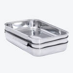 Absolut hygienischer Edelstahl, platzsparend stapelbar, spülmaschinenfest, jeweils 22 x 16 x 3 cm hoch (B/T/H), 750 ml Inhalt je Schale.