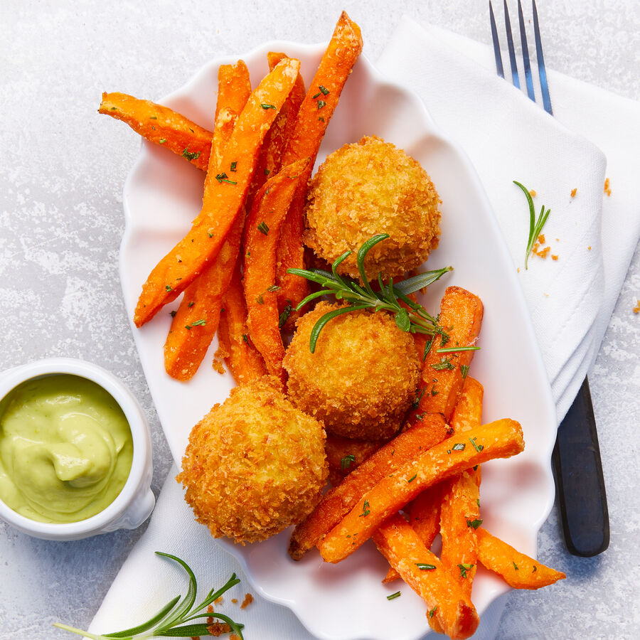 • Produktbild für ' Panko Poularden-Klößchen, Süßkartoffel Pommes und Avocado-Curry Mayonnaise'