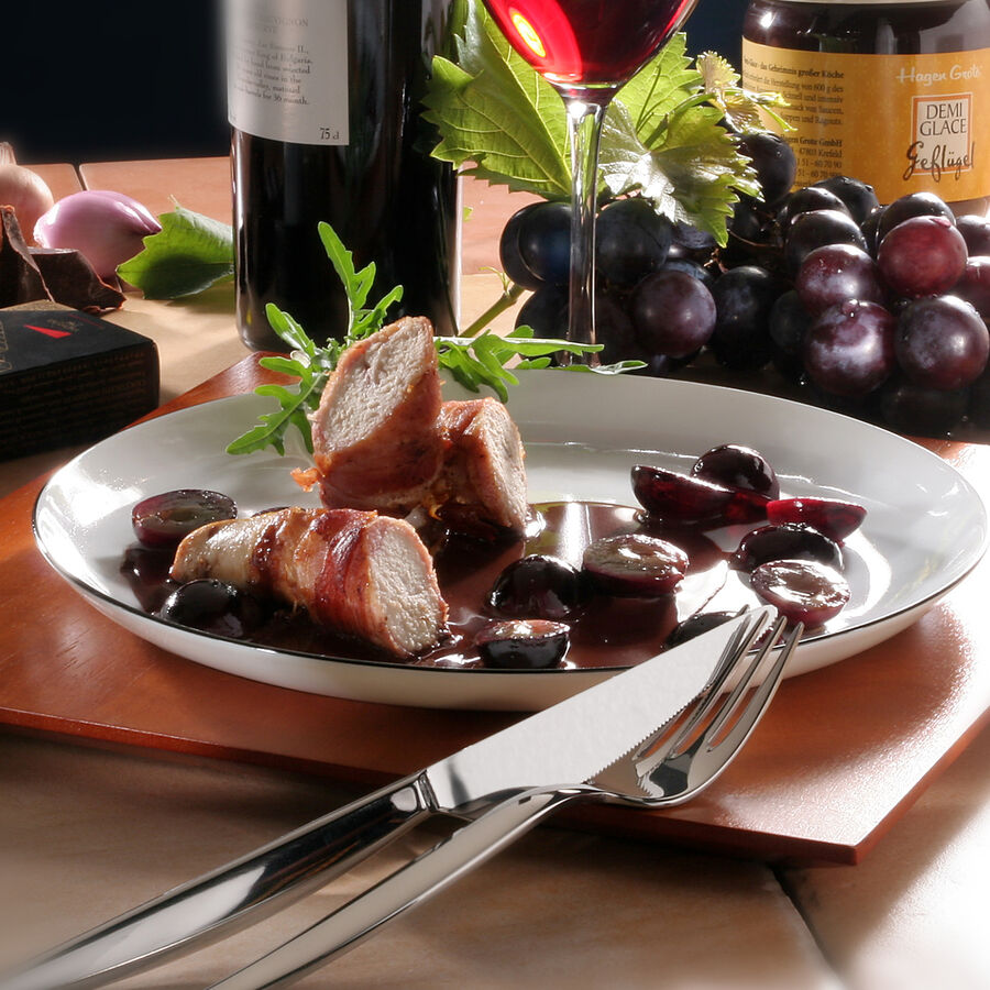 • Produktbild für 'Perlhuhnbrust im Speckmantel auf Trauben mit Schokoladen-Weinsauce'
