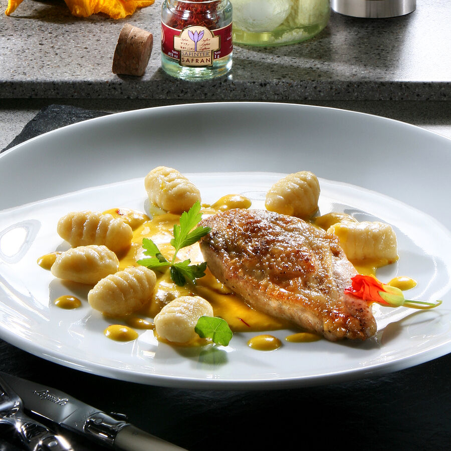 • Produktbild für 'Perlhuhnbrust mit Kürbis-Ziegenkäse-Gnocchi und Kürbis-Safran-Sauce'